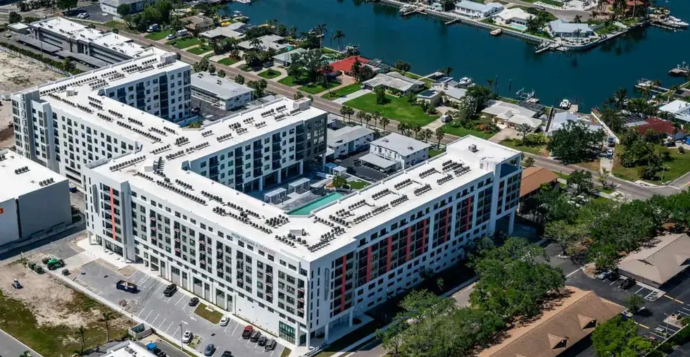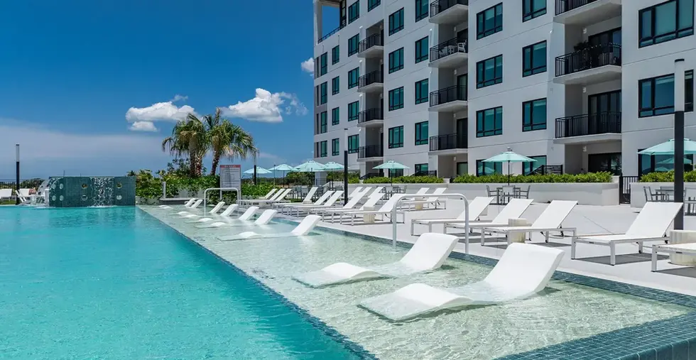 Waterfront-style or lake-adjacent community offering scenic views, relaxed living environment, outdoor spaces, pool access, and practical apartment layouts with balconies/patios.